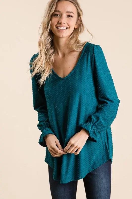 Nothing says sophisticated yet comfy like this Swiss-Dot Flared-and-Ruffled Sleeved Top! Pair it with jeans, trousers, or a skirt for a feminine, confident look!