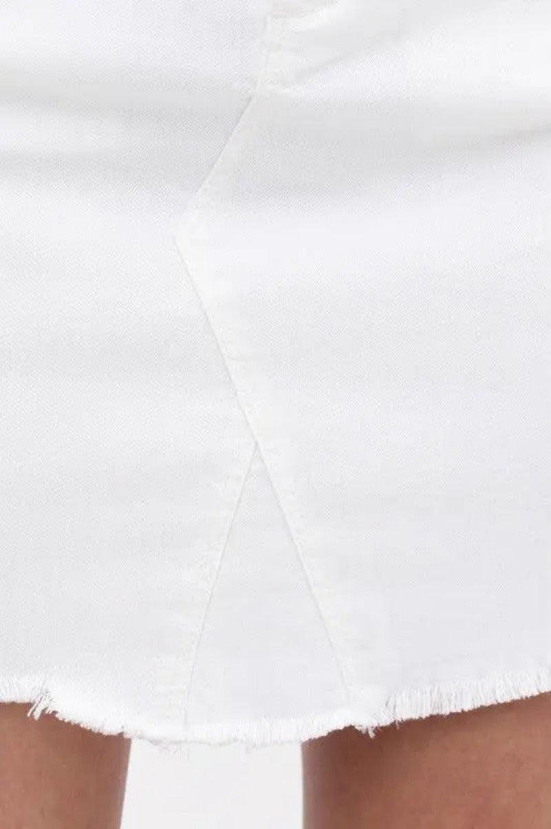 This white denim mini skirt is a wardrobe staple! It has pockets in the front and back, making it ideal for storing all of your essentials while on the go. The classic design with distressed hem allows it to be worn with any top, and the denim fabric ensures that it will last for seasons.