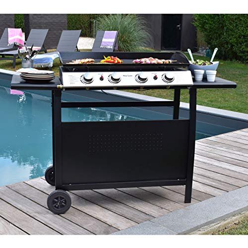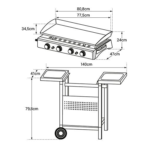 À propos de cet article Cuisinez de nouvelles saveurs en extérieur avec la plancha au gaz 4 brûleurs. Dimensions : Plancha + chariot : L 140 x l 55 x H 111cm – Surface de cuisson : L 77,5 × l 34,5cm × Ép 0,4cm Matières : Plancha + chariot + panneau de contrôle : acier isolant – Plaque de cuisson : acier émaillé laminé à froid – Brûleurs : acier inoxydable – Roues : polyéthylène Couleurs : Structure + plaque de cuisson : noire – Panneau de contrôle + brûleurs : inox – Chariot : noir À monter (notice incluse) – Garantie 2 ans – Livraison en 2 colis en pas de porte, en bas d’immeuble › Voir plus de détails