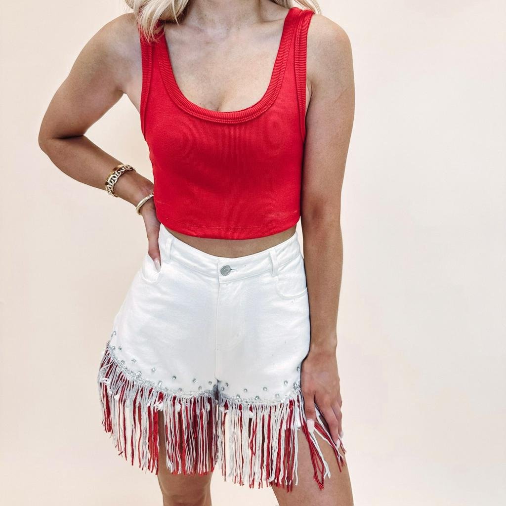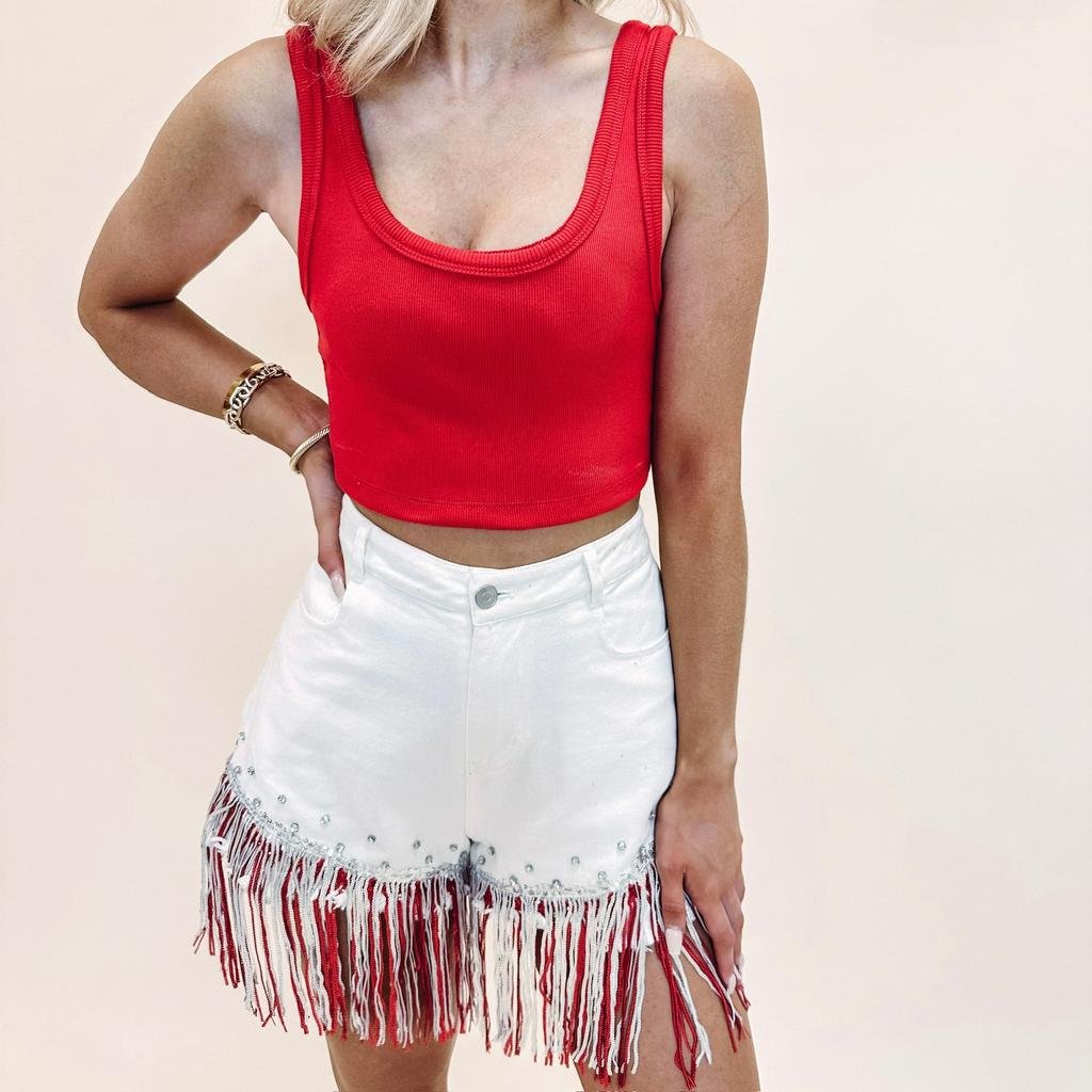 – White denim shorts with red/silver sequin fringe detail